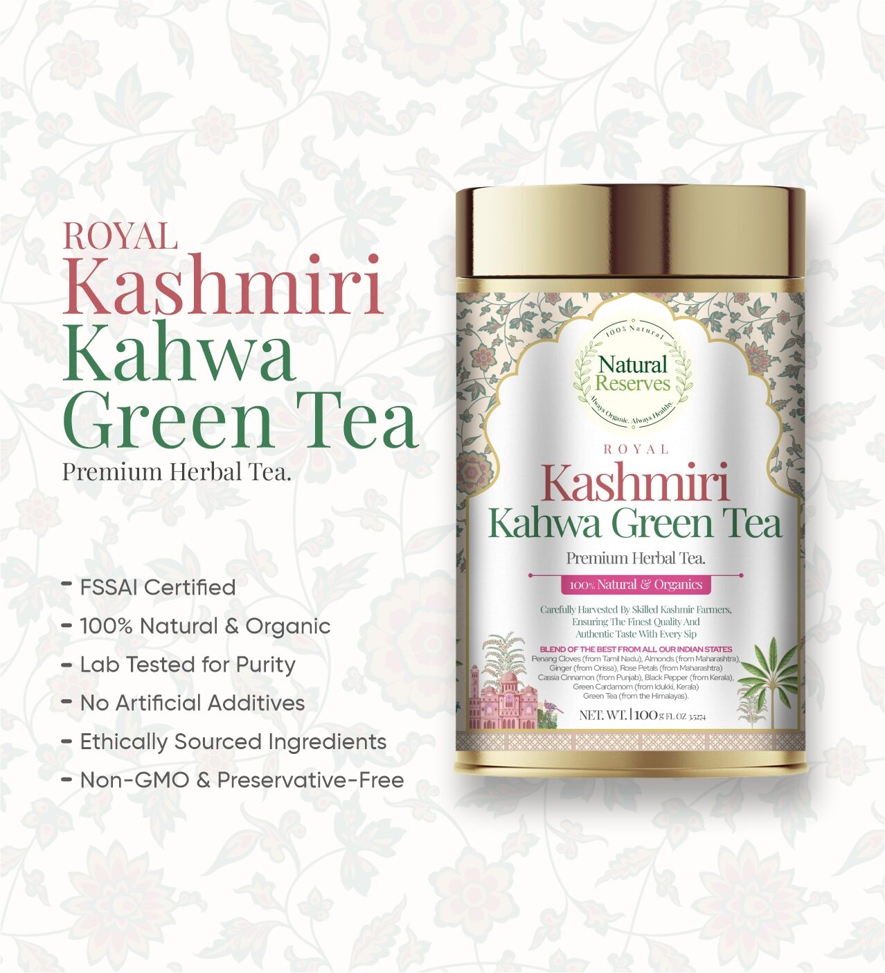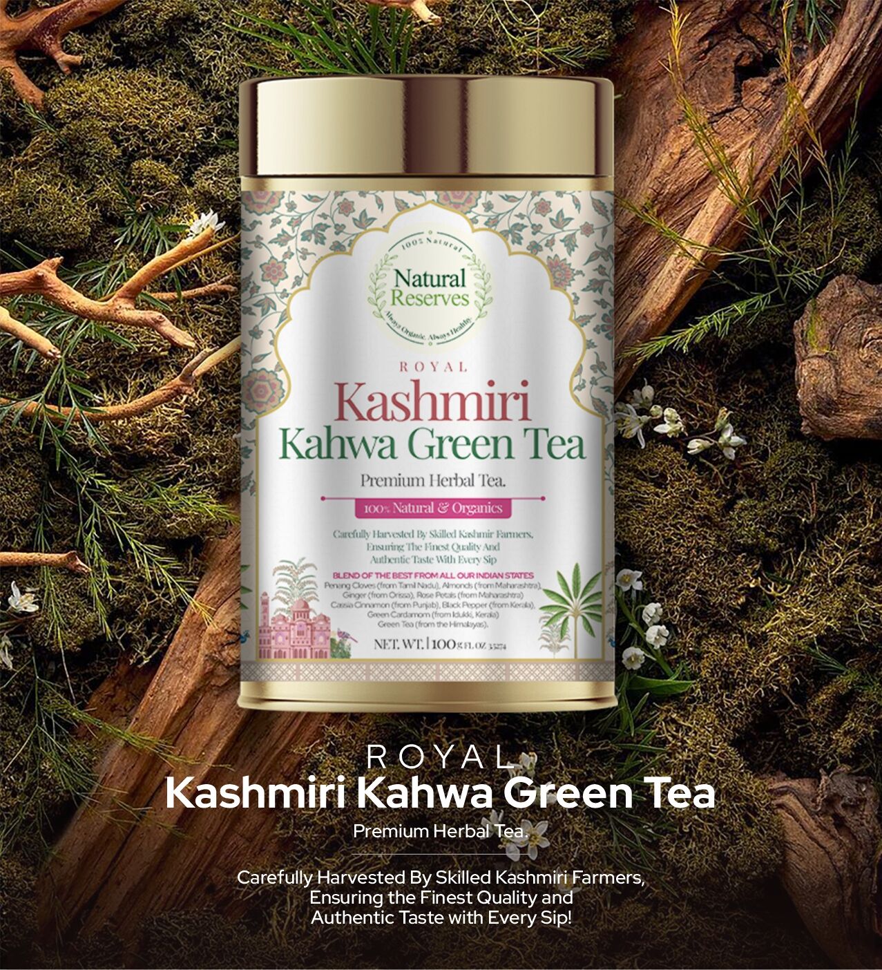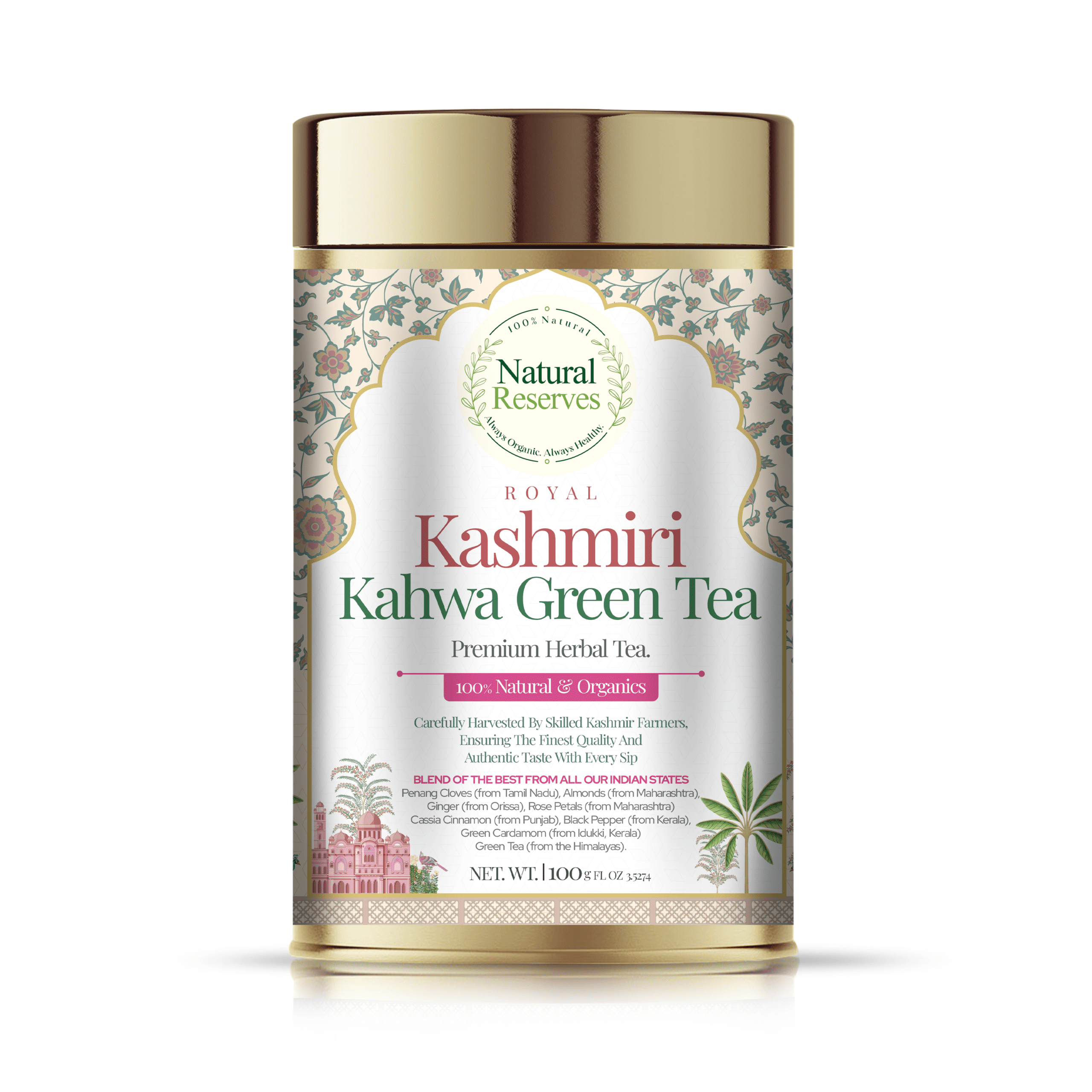 Experience the timeless tradition of Kashmiri tea culture with Natural Reserves Kashmiri Kahwa Green Tea. A luxurious blend of premium green tea and aromatic spices, our Kahwa offers a delightful taste of Kashmir in every sip.